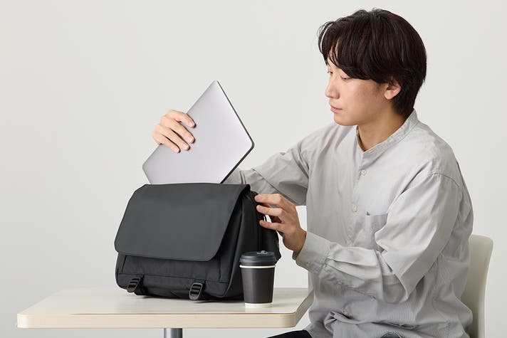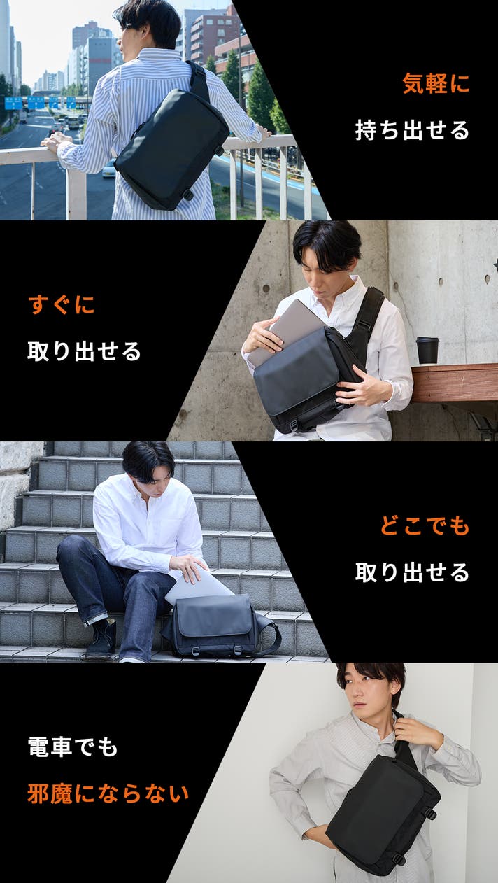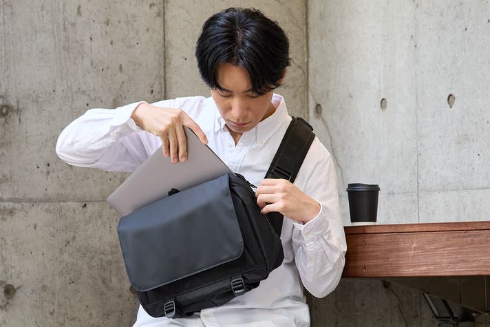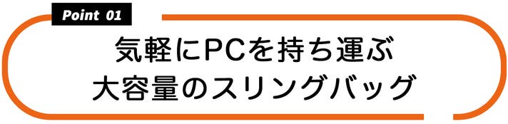 スリングバッグだからこそ、PCを身軽に持ち出せサッと取り出せる快適さ。