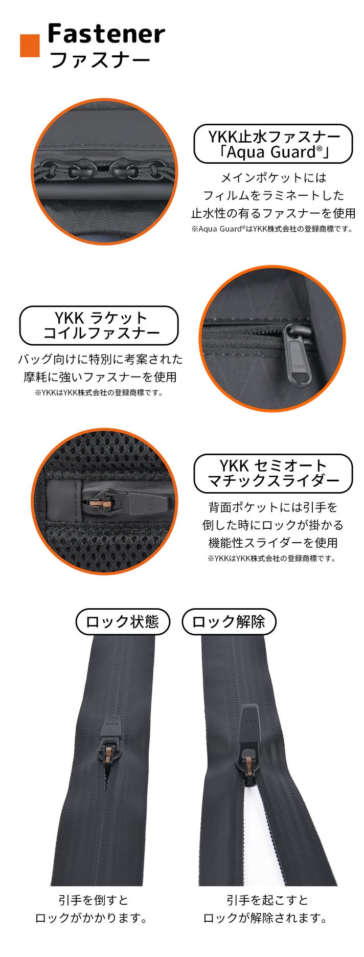 セイルクロスの技術を応用した3層構造で、中間層のフィルムが高い防水性を発揮しながら、強度が強く軽量で、日常使いはもちろん、アウトドアのような過酷なシーンにも対応できる性能を持ちます。