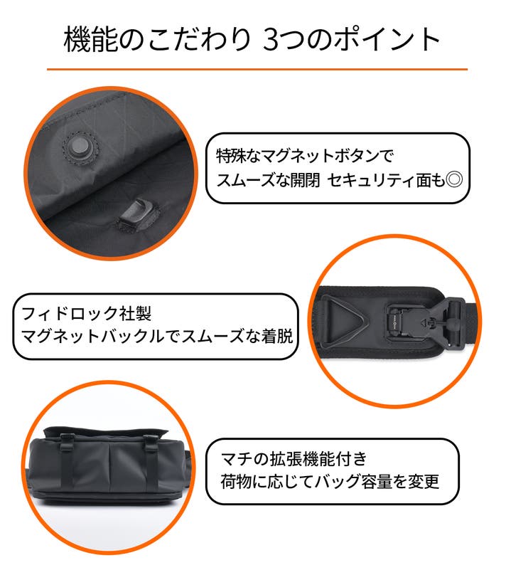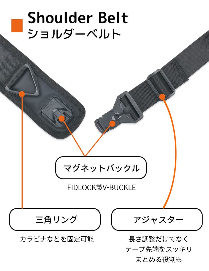 ショルダーベルトには、ドイツのパーツブランド【FIDLOCK】のマグネットバックルを使用しています。