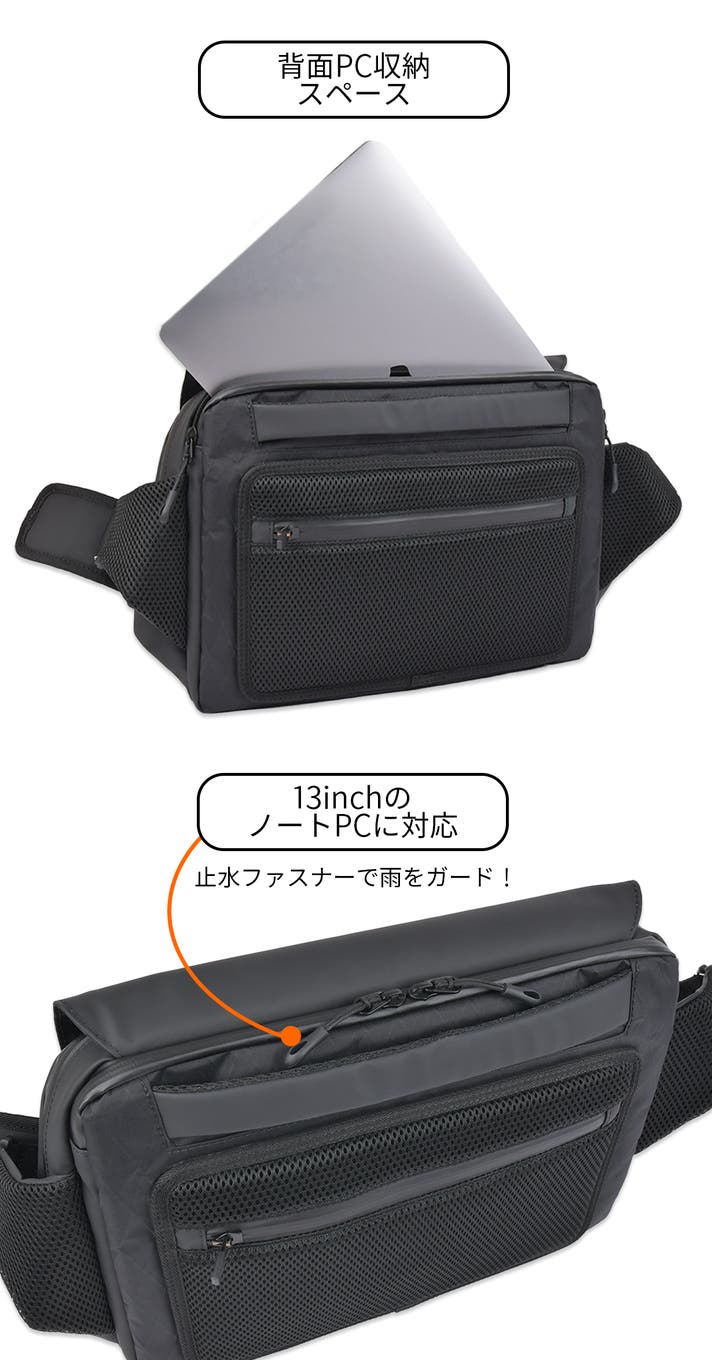 - 13インチのノートパソコンを収納可能。身軽なスリングバッグでPCをもっと気軽に持ち出せます。