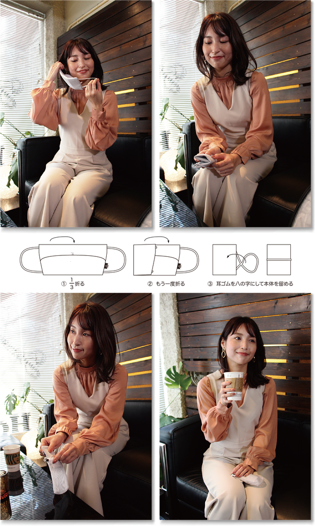 小さく三つ折りにたためられるのに、あらゆる顔にフィットすることができたのは、一枚の布を折りたたんでできた、特殊なデザインによるものです。
