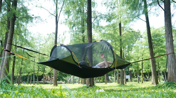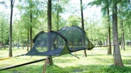TriHiveは、平置きテントとハンモックをシームレスに切り替えることができる、2WAYアウトドアテントです。