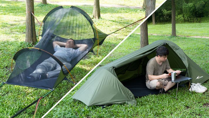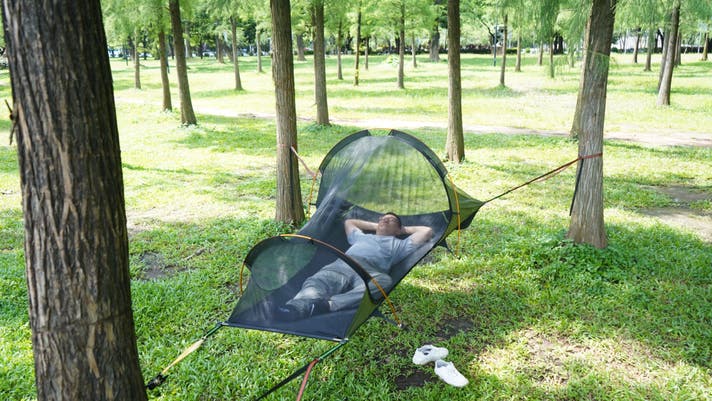 吊り下げれば地面の虫や爬虫類を避けられ、地面に設置すれば通常のテントとしても機能します。