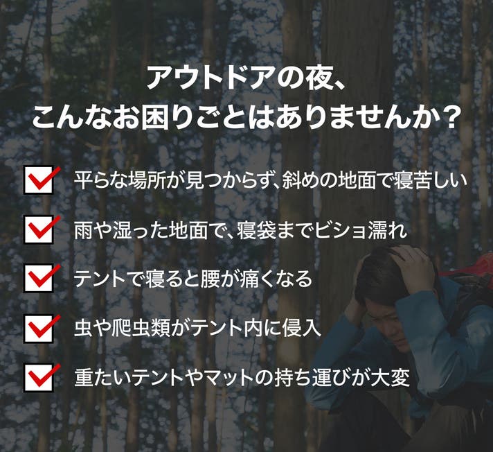 「Makuake(マクアケ)」は、実行者の想いを応援購入によって実現するアタラシイものやサービスのプラットフォームです。このページは、 プロダクトカテゴリの 「【空陸両用】地面に寝るだけがキャンプじゃない。設営3分&超軽量のハンモックテント」プロジェクト詳細ページです。