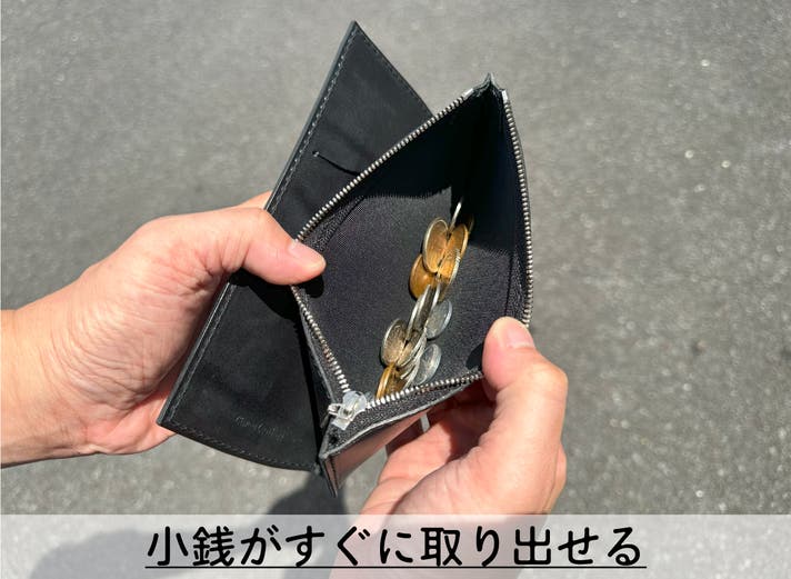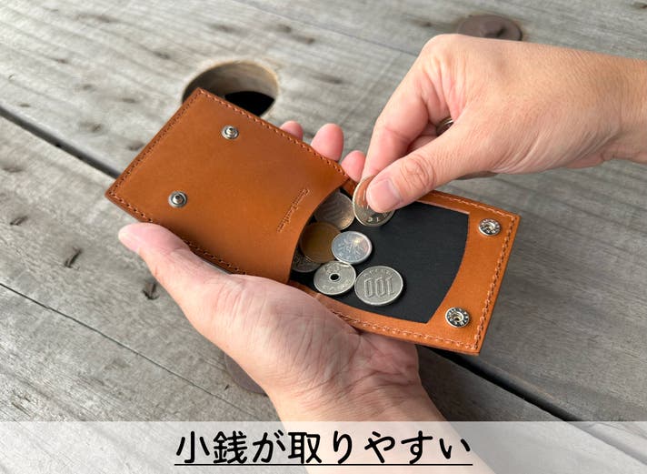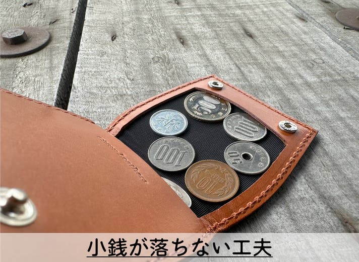 小銭が取りやすいのが特徴です。蓋裏側に配置した革製の枠に秘密があります。