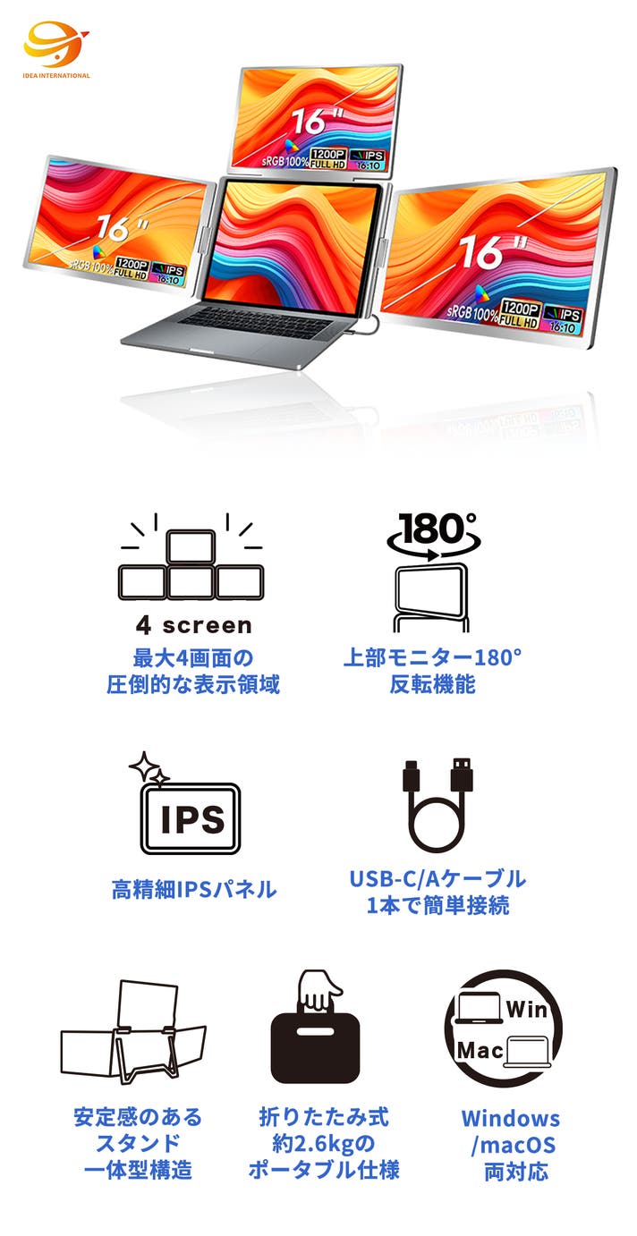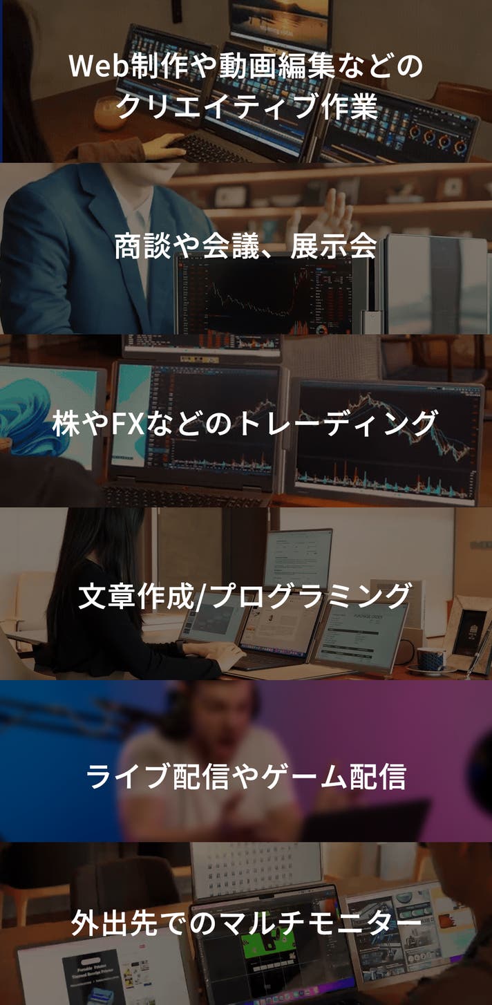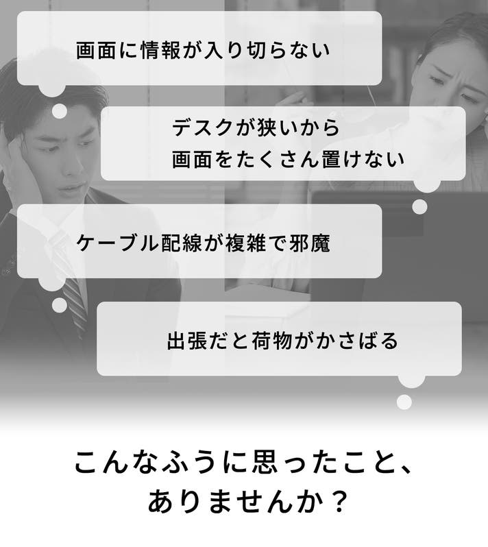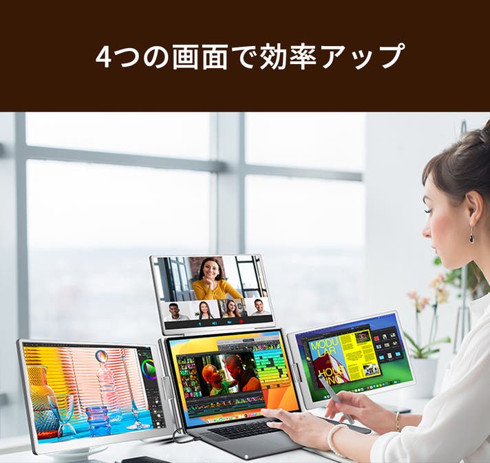 ノートPC一台では限られていた作業領域を、持ち運び可能な4画面環境に拡張することで、ビジネスパーソンの働き方そのものをスマートにアップデートします。
