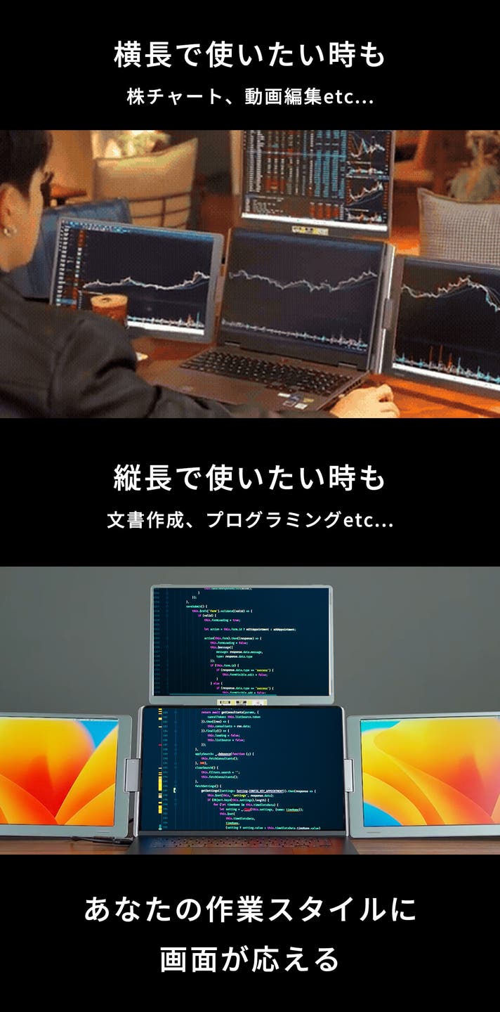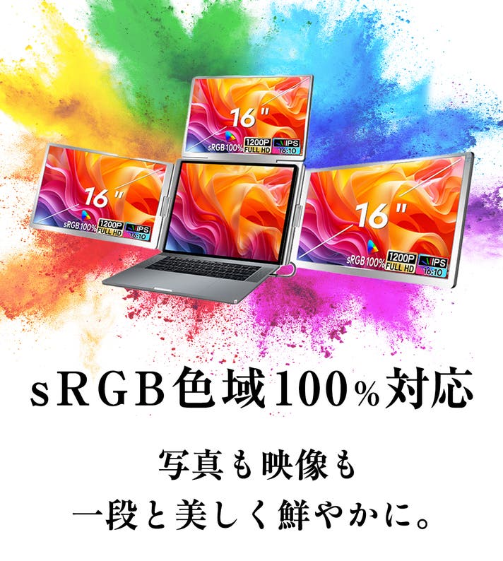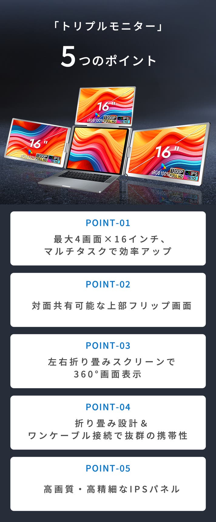 3画面でありながら約2.6kgと軽量&折りたたみ式だから、出張やテレワークにもぴったり。ビジネスマン、リモートワーカー、クリエイターまで、あらゆる働き方をサポートする多機能ディスプレイです!