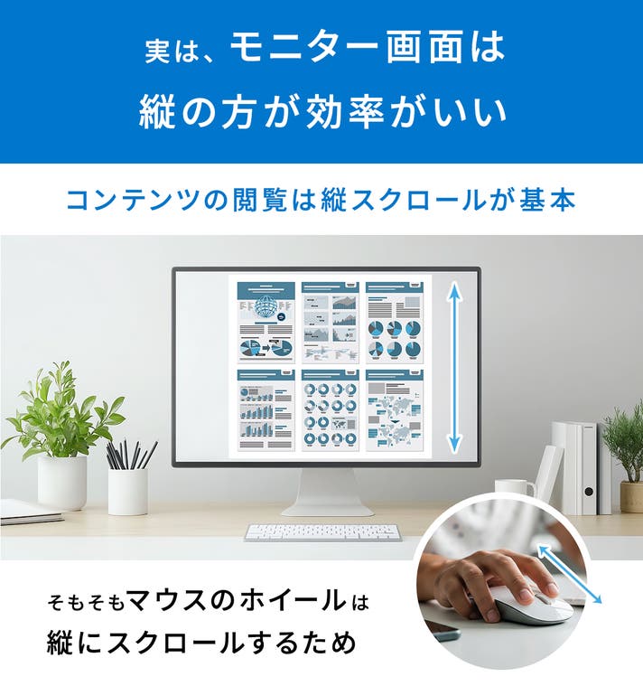 PC作業やネット閲覧は基本縦スクロール。縦型モニターなら画面全体を自然な視線移動で把握でき、作業効率もアップ。