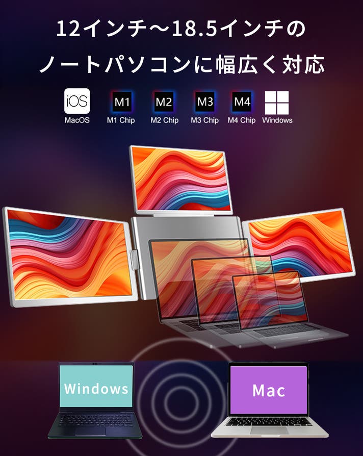 「トリプルモニター」は12〜18.5インチまでの幅広いノートPCに対応。