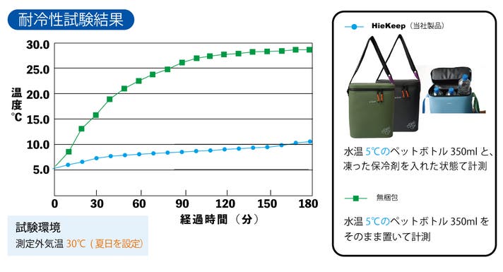 HieKeepに入れて置いた場合、2時間半を経過しても10℃以下を保っていることが分かります。