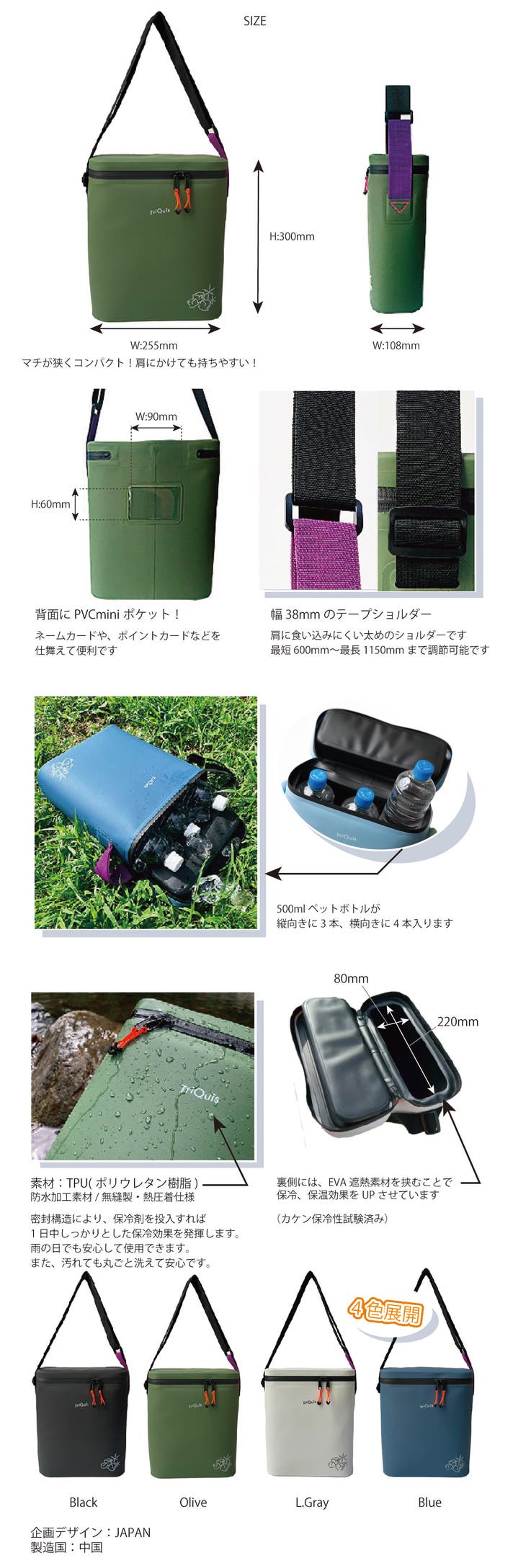 500mlのペットボトルが縦に3本、横に倒せば4本入る大容量サイズながらも、奥行をペットボトル1本のサイズギリギリまで狭くすることで、小脇に抱えられるようなコンパクトさとなりました。ショルダーベルト付きで、持ち運びも楽々です。