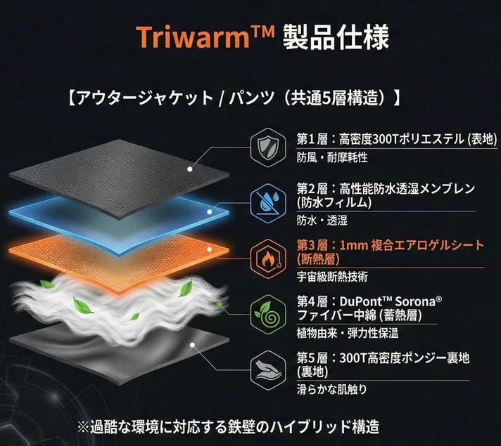 商品名 Triwarm™ 3Way エアロゲル・ジャケット&パンツ。