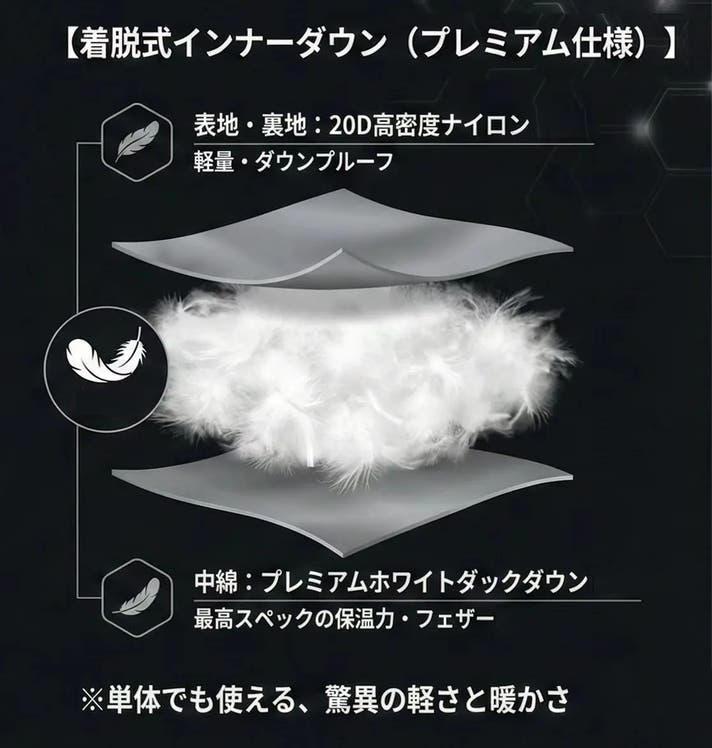 ダメ押しの「高機能インナーダウン」 さらに、真冬の氷点下にも対応するため、着脱可能なインナーダウンを用意しました。ここには妥協せず、高級寝具と同等水準の高機能ダウンを贅沢に封入。化学繊維(エアロゲル・Sorona)の強靭な断熱性と、天然ダウンのふんわりと包み込むような暖かさ。この2つを融合させることで、Triwarmは完成しました。