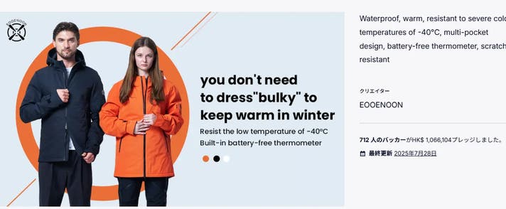 ■ グローバルな実績とこれからのビジョン 優れた保温性の追求と同時に、環境保護にも貢献する革新的なウェア開発を続け、これまで米国の「Kickstarter」をはじめとするグローバルなクラウドファンディングでも、世界中から多くの支持を集めてきました。