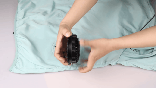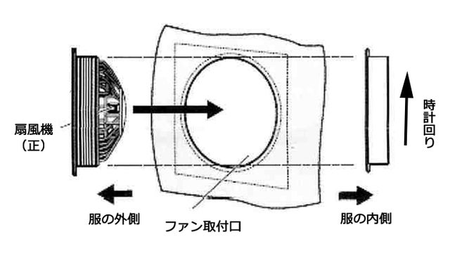 ②生地の裏側に向けて、ファンを取り付け口に差し込んでください。固定リングを時計回りにはめ込んでください。なお、ファンに左右の区別はありません。