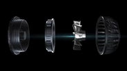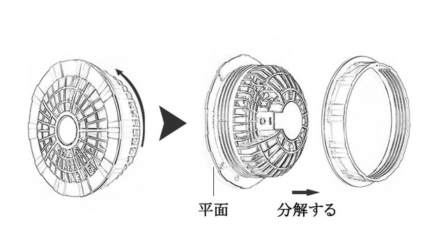 ①反時計回りに固定リングを回転させ、ファンと固定リングを分解させます。