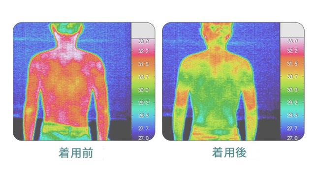 Tropcoolを10分間ほど着用した効果を赤外線で測定すると、着用後の体温は、着用前と比較して2~3度下がっていることがわかります。