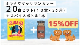 ■内容物:オキナワマッサマンカレー レトルト20食(10食ずつ2ヶ月に分けて定期配送)、スパイスボトル1本(初回配送時に同封)