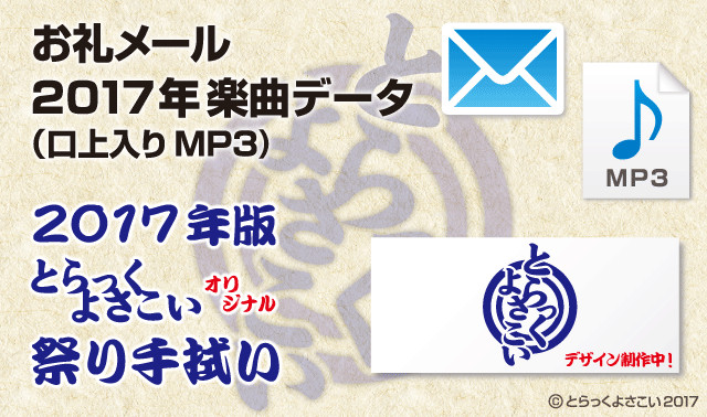 今年の衣装の柄をモチーフに、とらよさに欠かせない、今年のテーマ「御喜楽両々」や「とらっくよさこい」の文字をあしらったものとなります。