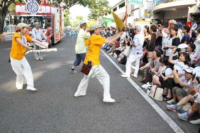 体験参加といっても、踊りを覚える必要はありません、踊り子と一緒に沿道のお客様を「よいさっほいさっ」の掛け声で一緒に盛り上げてください!!