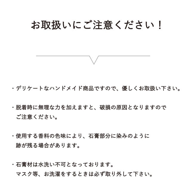 ※初期不良以外での返品・返金はお受けしておりません。 ※こちらはデリケートなハンドメイド商品となります。1つ1つ手作りとなります為、写真と異なる場合もございます。 ※天然石を使用しております為、それぞれの個体差により大きさや形が異なりますがご了承ください。 ※脱着時に無理な力を加えますと破損の原因となりますのでご注意ください。 ※使用する香料の色味によっては石膏部分に染みのように跡が残る場合がございます。 ※本品は水洗い不可となっております。マスク等お洗濯の場合は必ず取り外してください。 ※注文状況により出荷納期に遅れが出る場合があります。スケジュールに変更が生じる場合には、すぐにご案内させていただきます。 ※本文中に記載させていただいたスケジュールは、あくまでプロジェクト公開時点の予定です。原則として、配送遅延に伴う応援購入のキャンセルはできませんが、リターン配送予定月から3ヵ月を超えた場合には、希望者に限りキャンセルにて対応させていただきます。