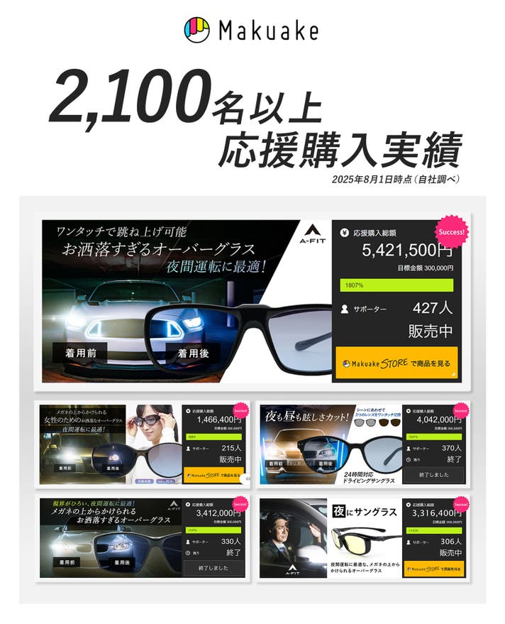 当社では、2021年6月に「【夜間運転用A-FIT究極のオーバーグラス】を発表以来、Makuakeにおいて夜間運転に対応したオーバーグラスを7プロジェクト実施し、2,100名以上の皆様に応援購入いただいております。この度、より多くのメガネに対応するオーバーグラスをベースに、日本製の夜間運転に適したレンズをセットしてお届けします。