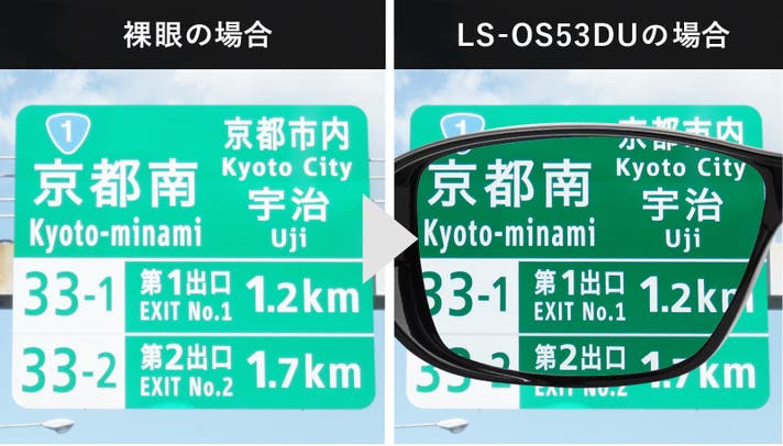 LS-OS53DUはメガネのリム(レンズ枠)上部にフレームをセットしてかけられる設計になっています。かけてこれまで対応が難しかった丸形のメガネやプラスチックフレームもより対応可能となりました。
