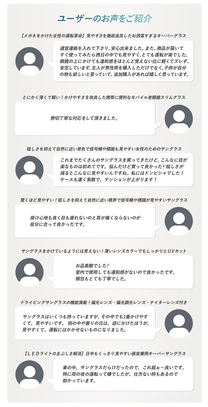 本商品はいかにもサングラスをかけているというイメージを払拭し、通常のメガネをかけているようなイメージでしっかりとUV対策ができ、また、ノーメイクでもかけるだけでアイメイクをしたような目元に見えるサングラスです。年中降り注ぐ紫外線対策に最適で、季節に関係なく1年中ご愛用いただけるサングラスです。
