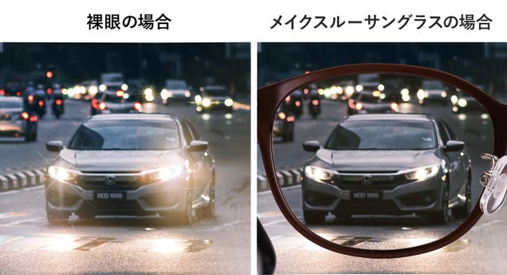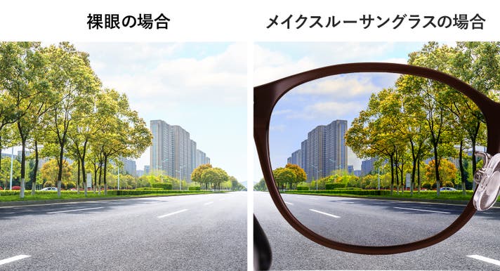 メイクスルーサングラスは透明系のレンズをベースにしているため、メガネをかけているのと同様、クリアでより自然な視界をお届けします。