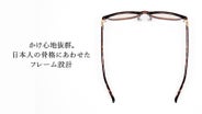 当社はこれまで40年以上にわたりメガネの産地福井でメガネフレームやサングラスのデザイン企画会社として歩んでまいりました。毎年100型以上デザインをおこすなかで、4,000名以上の日本人の頭部データをもとに当社独自の基準と企画を進めており、当社だからできるかけ心地のよい商品をご提供します。日本人の顔にあう緩やかなカーブ設計で、顔を包み込むような快適なかけ心地を実現。かけていると自然に肌になじみ、締め付け感のないかけ心地で長時間のご使用でも快適にかけられます。