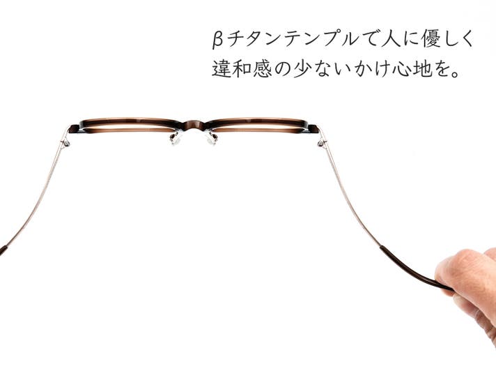 人工関節やペースメーカー等医療分野でも活躍するβチタン材をテンプル素材に採用。しなやかで強度に優れ、お肌にやさしい先端技術による素材で頭部を優しく包み込むように掛けられます。
