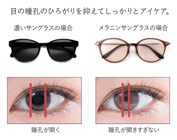レンズカラーの濃いサングラスをかけると目の瞳孔が開き、レンズの隙間等から目に入る紫外線の量が増えてしまいます。また、サングラスを外した際も急激に瞳孔が狭まることになり、疲れやすくなります。当商品のレンズは、うすめのレンズカラーを採用しているため、瞳孔が開きすぎず、優しく紫外線から目を守ります。
