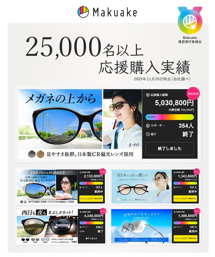 2019年5月Makuakeで初めてプロジェクトを開始し、今回117作品目のプロジェクトとなります。これまで25,000名以上の方々に応援購入いただいており、皆様の温かいお言葉に支えられてまいりました。Makuakeをご利用いただいている方々に本当に良いサングラスをお届けいたしたく、日々商品開発を行っています。安心して応援購入いただきたく、よろしくお願いいたします。