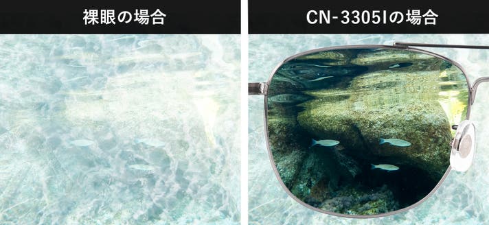 偏光レンズ(偏光機能レンズ)は、偏光膜をレンズで挟み込んで一定(縦)方向の光しか通さないつくりとなっています。家庭用品品質表示法による偏光サングラスの基準に偏光度は90%以上と定められていますが、CN-3305Iは偏光度をあえて96%に設定して視界の暗さや違和感を抑え、より自然でクリアな見え方を重視した設計です。