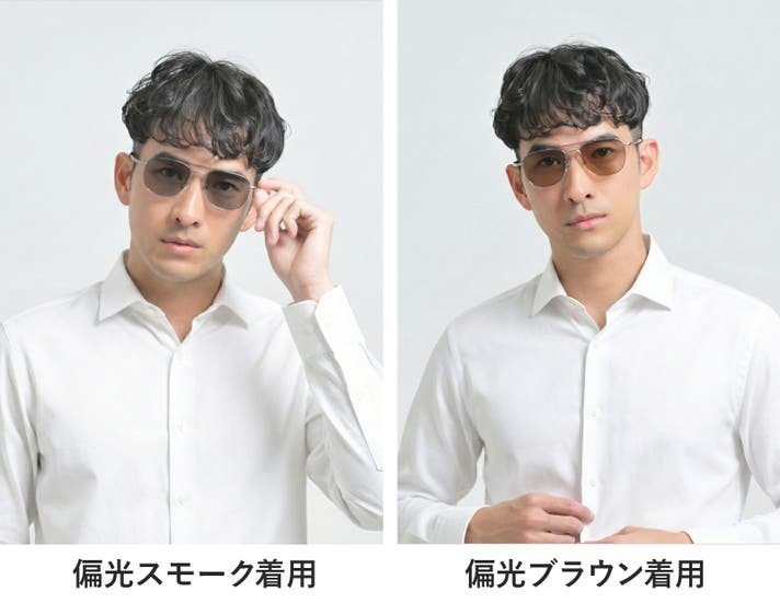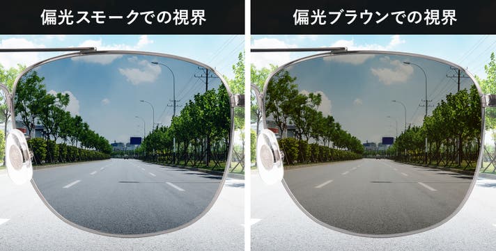 偏光スモークレンズと偏光ブラウンレンズの2種類をご用意しました。それぞれのカラーで特性が異なり外見上の見られ方も変わります。下の比較画像をご参考いただき、ご使用するシーンに最適なカラーをお選びください。