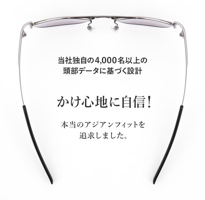 メガネの産地・福井で40年以上のデザイン実績を持つ当社は、4,000名以上の日本人頭部データに基づく設計を行い、フレーム素材には軽量で強度に優れたチタンを採用。メガネフレーム同様の品質と快適性を追求しました。