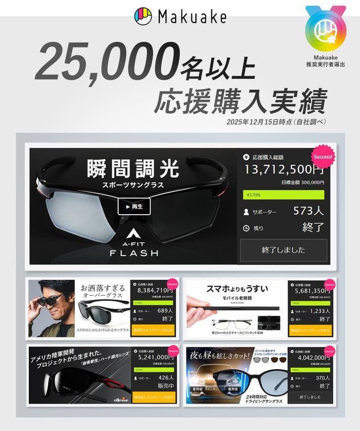 2019年5月Makuakeで初めてプロジェクトを開始し、これまで117プロジェクトを実施し、25,000名以上の方々に応援購入いただいております。皆様の温かいお言葉に支えられてまいりました。Makuakeをご利用いただいている方々に本当に良いサングラスをお届けいたしたく、日々商品開発を行っています。2025年10月にはMakuake推奨実行者にも選出され、皆様には安心して応援購入いただきたく、よろしくお願いいたします。