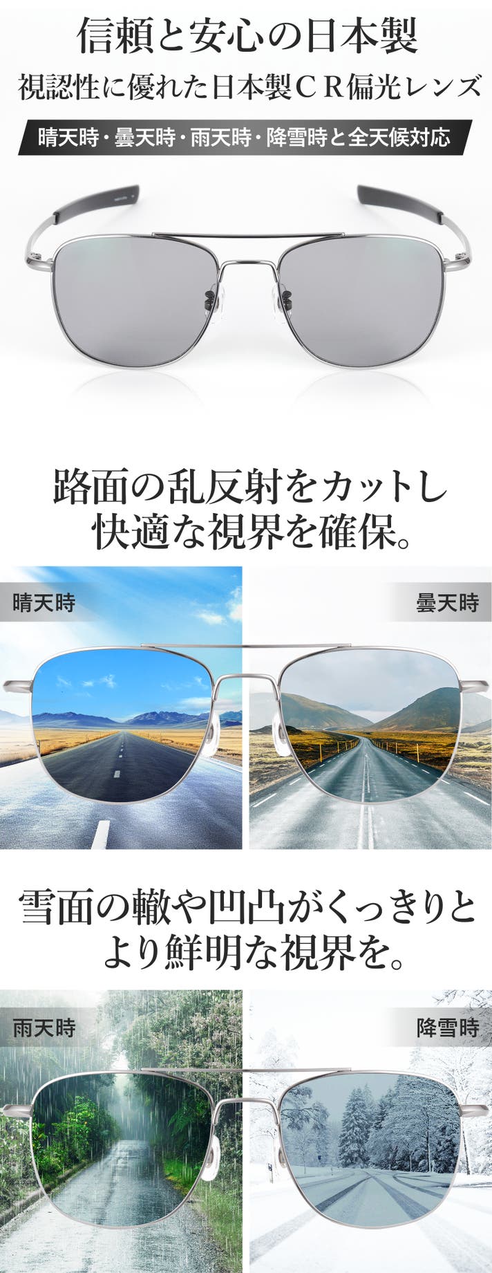 晴天時はもちろん、曇天・雨天・降雪時でも快適な視界を確保するため、日本製のCR偏光レンズを採用したドライビングサングラスです。