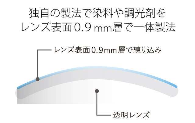 通常のサングラスレンズを製造する場合、カラー染料や調光のための添加剤をレンズ表面に塗布する方法が一般的で、そのため衝撃により表面のコーティングが剝がれやすくなります。