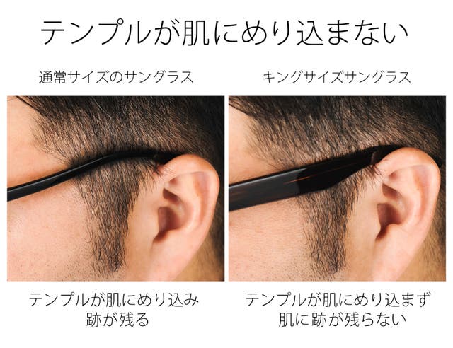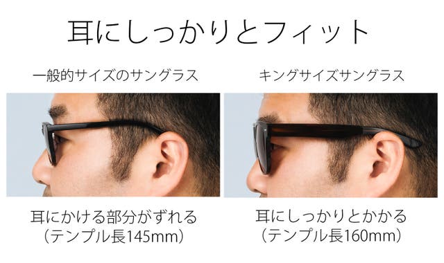 通常のサングラスは短すぎて、テンプルの曲げ位置(耳にかかる部分)が耳の位置よりも前に来てしまい違和感の原因となります。当商品のテンプルは通常サイズのサングラスよりも15mm程長く耳にフィットします。