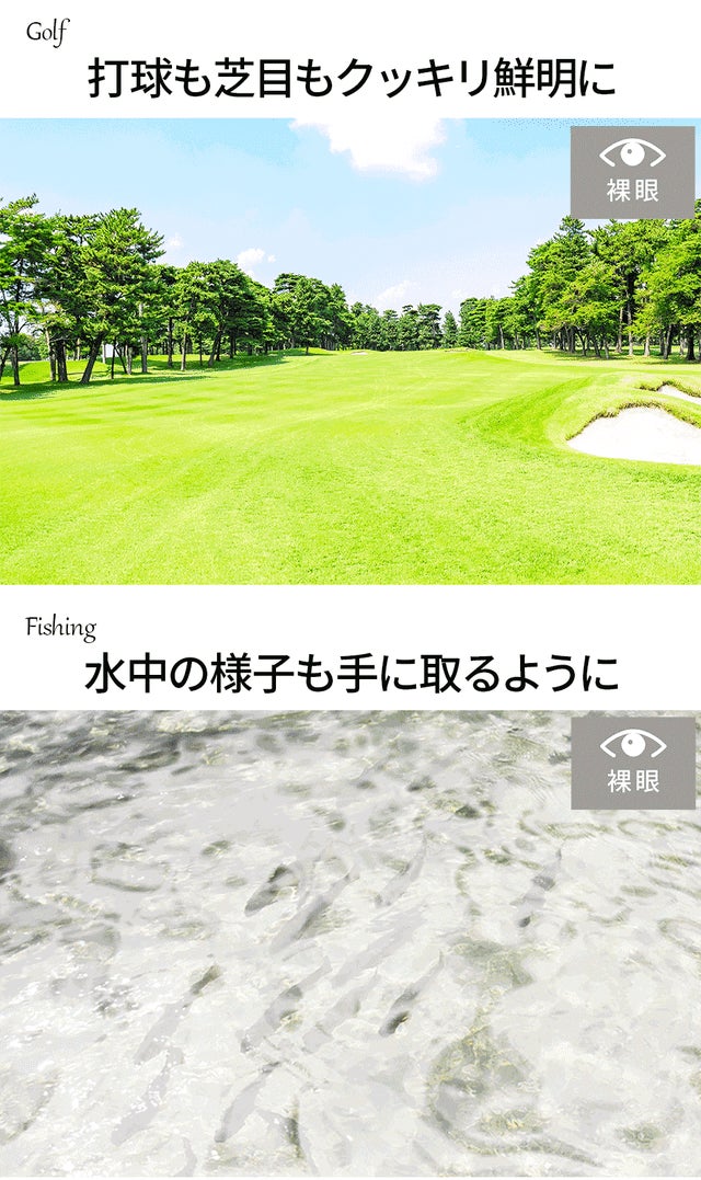 偏光レンズは乱反射をカットするため、路面や芝目、水面下がよりくっきりと見やすくなります。