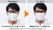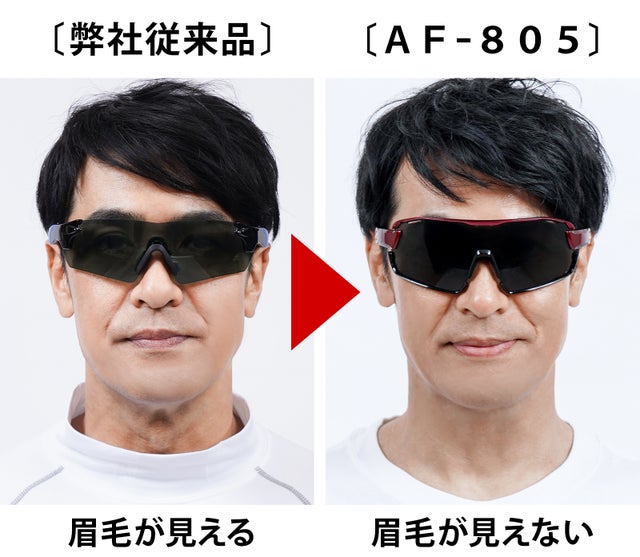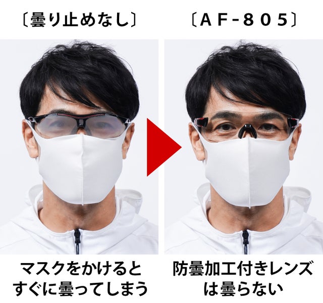 (※上記は弊社従来品(左側)との比較写真です。またモデル着用写真(右側)の商品は、先に発表したA-FIT/AF-804ですが防曇加工は同じ仕様を採用しています)