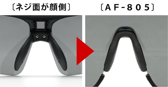 弊社従来品はネジ頭が鼻の方に向いているため、ネジが緩んだ場合、鼻にあたってしまいます。A-FIT/AF-805はネジを下から締めているため、ネジ頭が鼻にあたらない設計になっています。