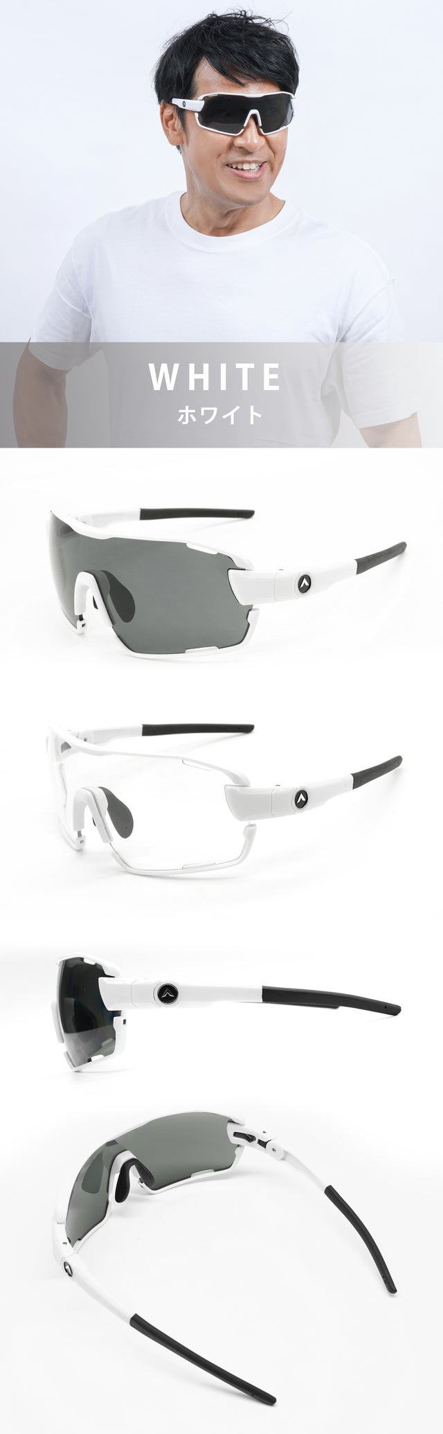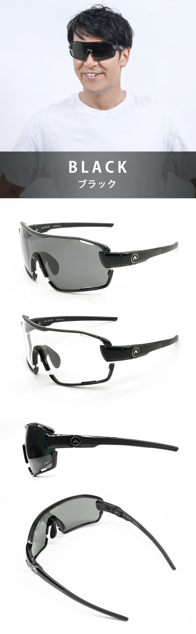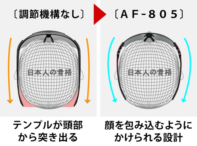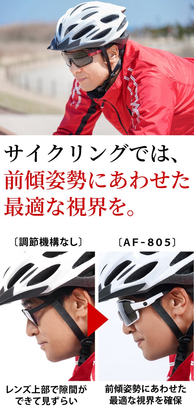 Makuake応援購入者数7600名超!メガネの産地福井の当社が、4000名を超える顔幅・瞳孔距離・テンプル長の頭部データに基づき、日本人がかけやすくて見やすいスポーツサングラスは何かを考え、2年の開発期間を経て発表します。A-FIT ADJUST「AF-805」左右各7段階の調節テンプルと自由自在に調節できる鼻パッド、さらに調節可能なテンプルエンドのゴムモダンで、ご自身のお顔に、また、ご使用シーンにあわせてジャストフィットできるスポーツサングラスです。今回のモデルは前作AF-804をさらに進化させ、レンズカバーを設けることで、自転車等で万一転倒した際、頭部への安全性をより高め、さらに、ひろい視野を確保できる設計になっています。