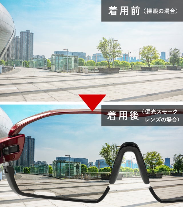 (※上記左側の写真は目の位置がレンズ上部にきて枠が視界に入ることをわかりやすくするため、弊社従来品で通常のサングラスと比較しています)