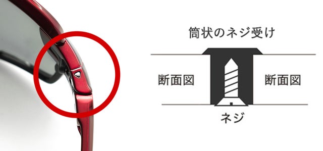 ネジの緩みとテンプルのパタツキを極力防止するため、ダブルロック式ネジを採用した丁番を採用。万一ネジが緩んでも簡単に締め直すことができます。