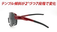人の顔はひとりひとり違う上に、左右対称ではありません。また耳の高さも左右違うため、サングラスをかけた際、しっくりこないこともあります。当社では、より多くの皆様に快適にかけて頂けるよう、左右のテンプル傾斜を2°づつ7段階(一番最初に固定した位置が1段階目)に変えられるサングラスを開発しました。ひとりひとりのお顔にあわせた調節が可能になりました。また、テンプル角度調節によってレンズ傾斜も変えられるので、ご使用シーンにあわせて最適な視界が得られます。
