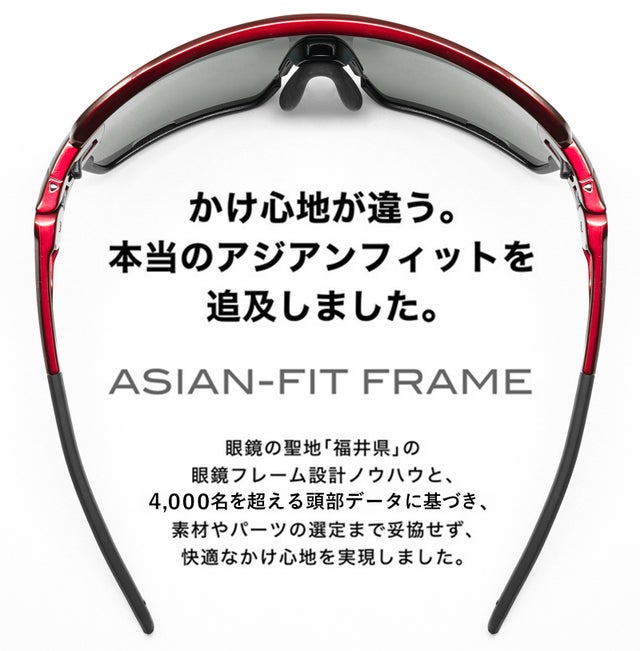 日本人の顔は、欧米人の顔に比べて平面的で前面が広くなっているため、欧米人向けのフレームだと締め付け感やずれが生じてしまいます。A‐FITスポーツサングラスのフレームは4000名を超える日本人の頭部データをもとに設計されており、顔を包み込むように快適に装着できます。