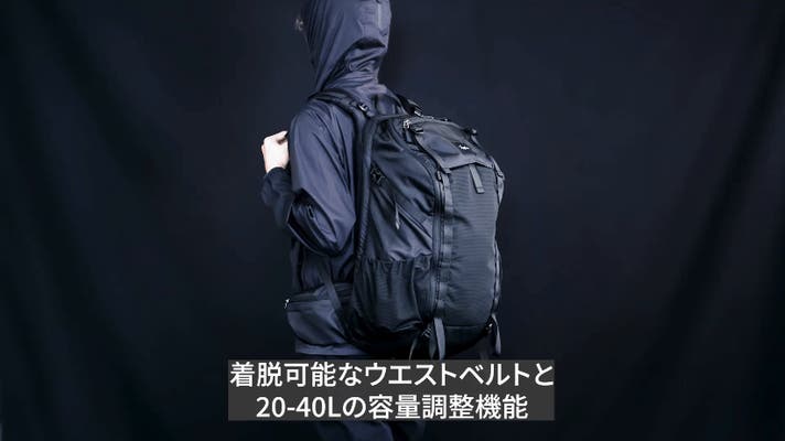 取り外し可能なウエストベルト、また容量調整可能な左右6箇所のベルトを使用することで20-40Lまでのサイズ調節が可能です。