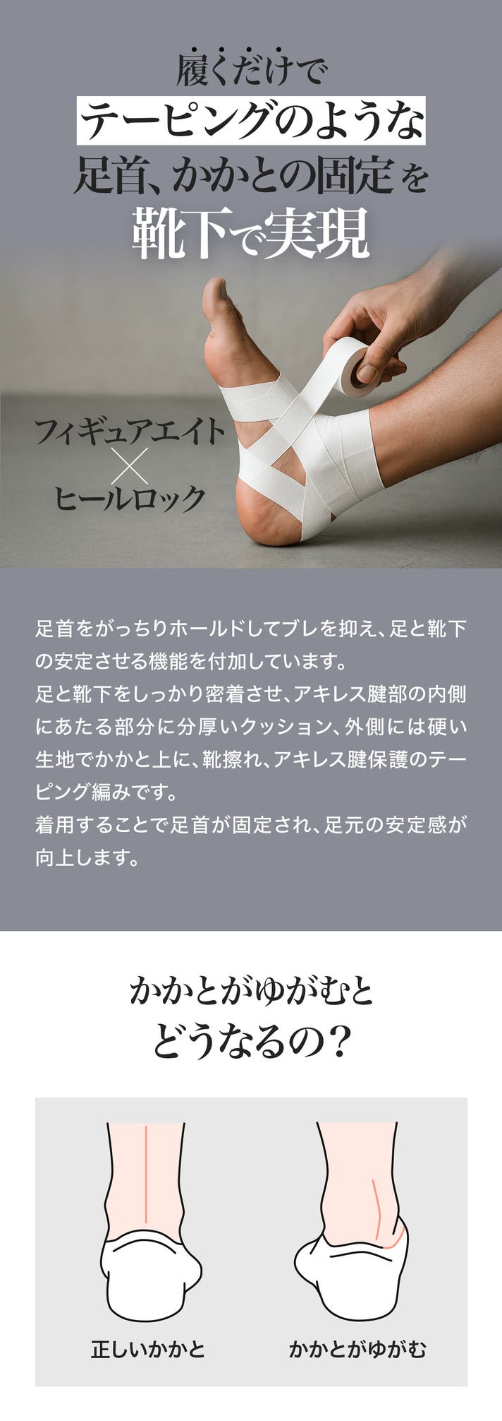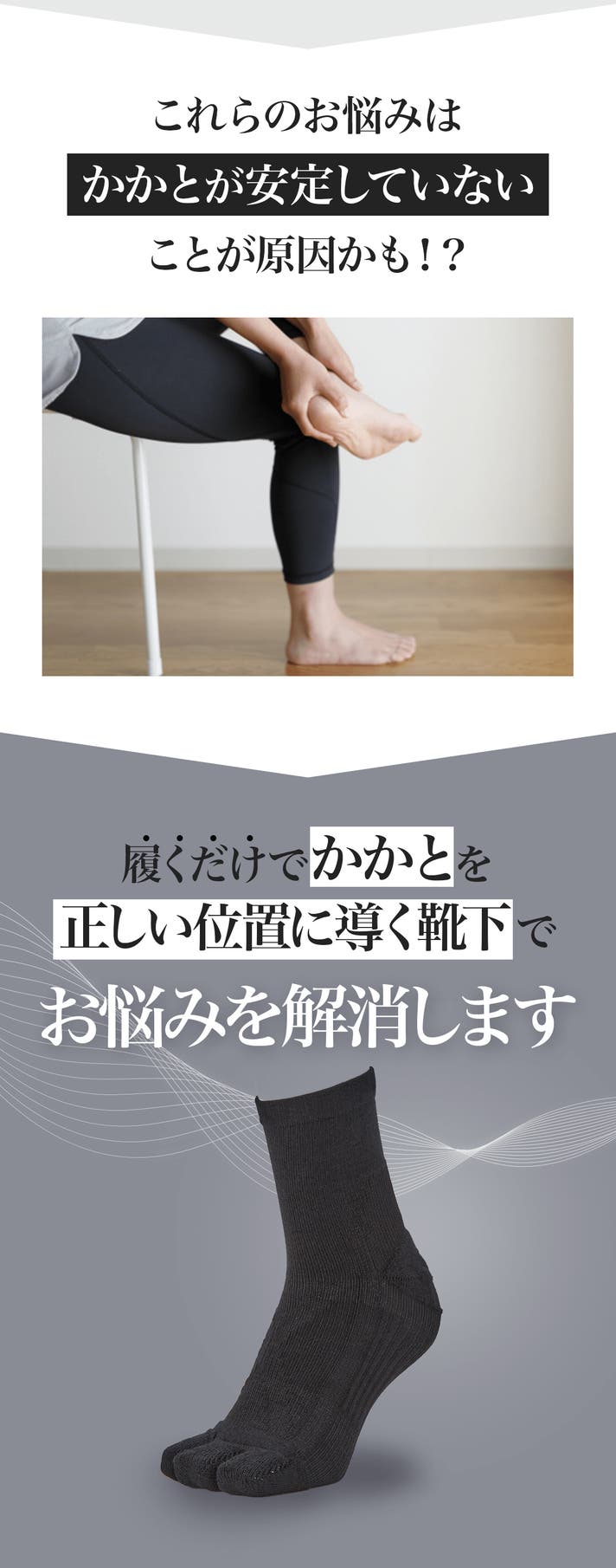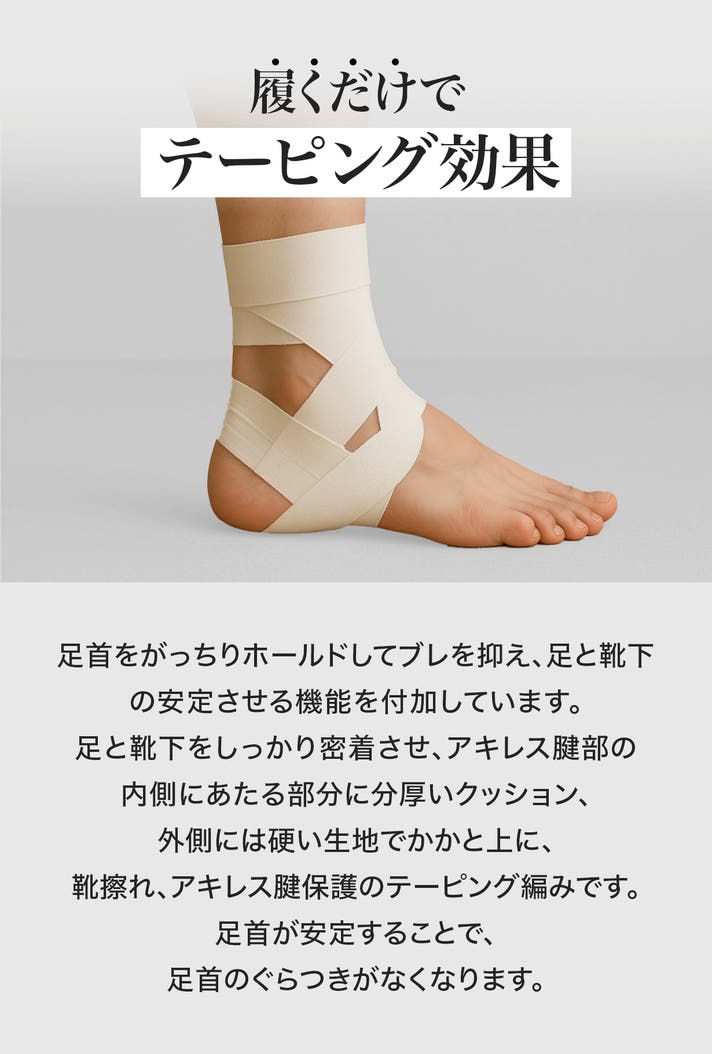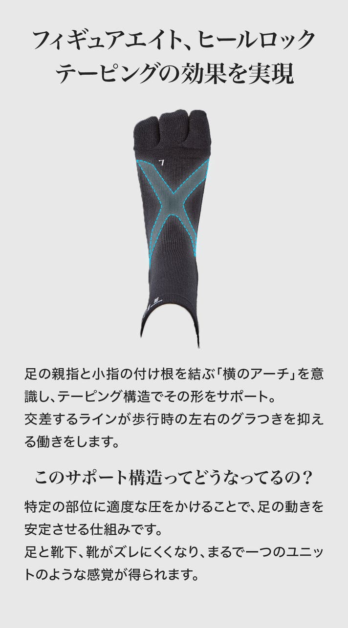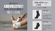 - 足の専門家と共同開発。テーピング、インソール技術を搭載した高機能靴下でかかとから体幹を支える